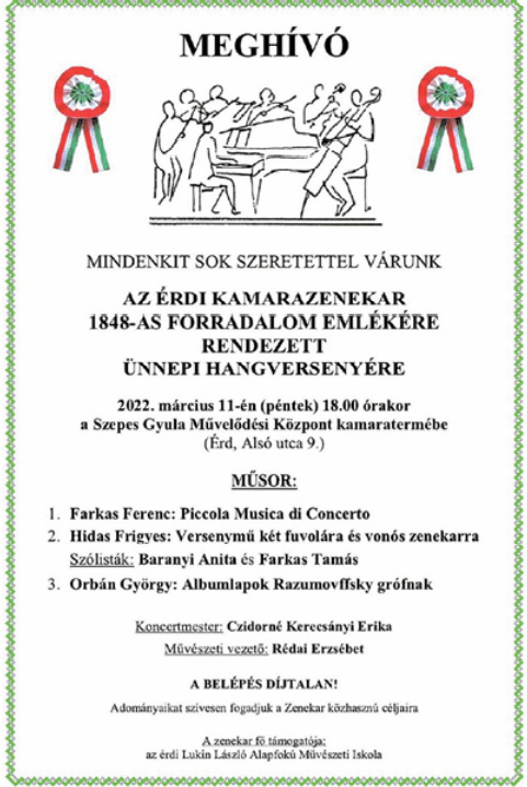 Március 11-én az 1848-as forradalom emlékére ad ünnepi hangversenyt az Érdi Kamarazenekar, 18 órától, a Szepes Gyula Művelődési Központban. A műsorban Farkas Ferenc, Hidas Frigyes és Orbán György művei csendülnek fel.