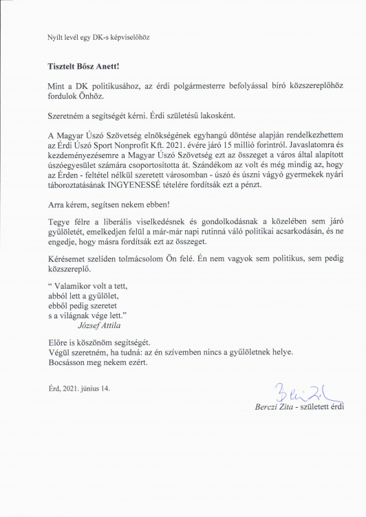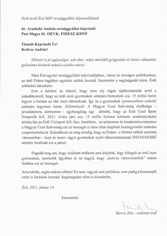 Újabb fejezetéhez érkezett a hányatott sorsú érdi úszóélet története: a tavaly nyáron újjáalakult cég elődjének egykori vezetője, Berczi Zita különös hangú nyílt levélben fordult egyrészt Bősz Anett országgyűlési képviselőhöz, másrészt Aradszki Andráshoz, a választókerület hivatalos képviselőjéhez, hogy járjanak közbe az idei érdi úszótábor ingyenessé tétele ügyében.