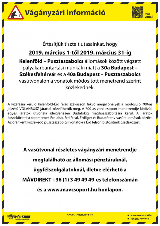 A MÁV-START Zrt. tájékoztatása alapján március 1-31. között a Kelenföld – Pusztaszabolcs állomások között végzett pályakarbantartási munkák miatt a Budapest – Székesfehérvár és a Budapest – Pusztaszabolcs vasútvonalon módosított menetrend szerint közlekednek a mellékletben található vonatok.