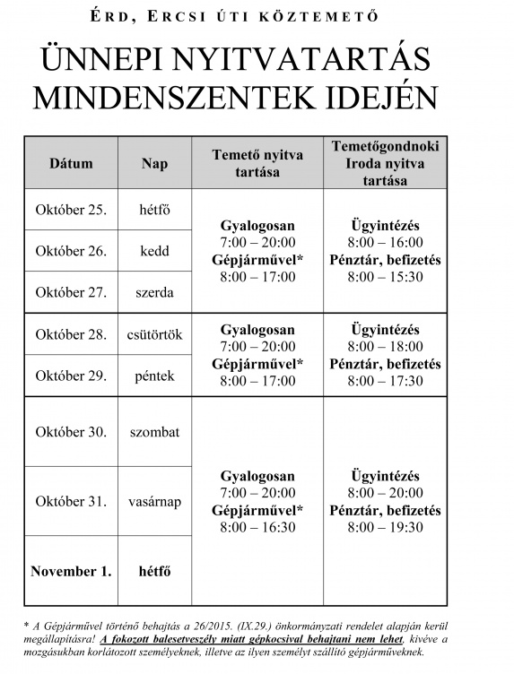 Mint Grabovszky Ildikó üzemeltetési ágazatvezető elmondta, a temetőbe csak a Jolán utca felől lehet behajtani, és kizárólag a mozgásukban korlátozott személyeket szállító járműveknek - ezt a közterület-felügyelők ellenőrzik is. Sötétedést követően, azaz 16 óra 30 perctől már nem engednek be semmilyen járművet az Ercsi úti sírkertbe.