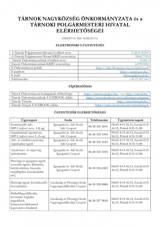 Március 8-ától szünetel a személyes félfogadás Tárnokon, a hivatal személyesen kizárólag előzetes időpont-egyeztetés után fogad ügyfeleket. Ügyeletet 8 és 12 óra között tartanak munkanapokon, a polgármesteri hivatal csak ekkor van nyitva.