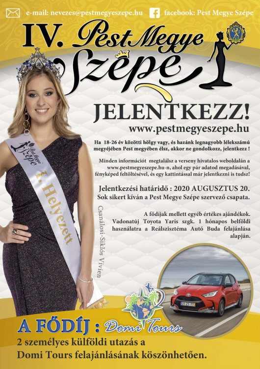 Augusztus 20-ig még várják a jelentkezőket. Június elsejével ugyanis elindult a jelentkezés a IV. Pest Megye Szépe választásra. A szervezők olyan, Budapesten vagy Pest megyében élő hajadon, gyermektelen hölgyek jelentkezését várják, akik a 18. évüket már betöltötték, de legfeljebb 26 évesek – mondta el a versenyigazgató. Bada Zoltán hozzátette: az idei évtől a kisebb, nem látható, vagy jól takarható helyen lévő tetoválás nem kizáró ok.