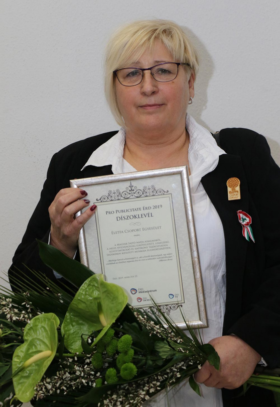 Az Életfa Csoport Egyesület nyerte el idén az Érd Médiacentrum Pro Publicitate Díját, amit a március 15-ei városi ünnepségen adott át T. Mészáros András polgármester és Fekete Zoltán, az Érd Médiacentrum főszerkesztője Tarsoly Anikónak, az Életfa tiszteletbeli elnökének.