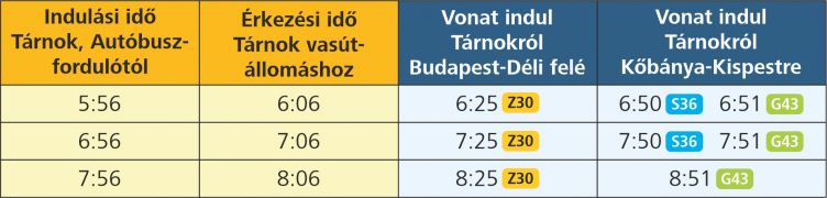 Tárnokon október 17-én, vasárnap, a reggeli órákban az autóbusz-fordulótól 5:56 és 7:56 között induló buszok és a Budapest felé közlekedő vonatok között az átszállási idő jelentősen megnövekszik, mert módosulnak a csatlakozási időpontok a vasúti pályakarbantartás idején.