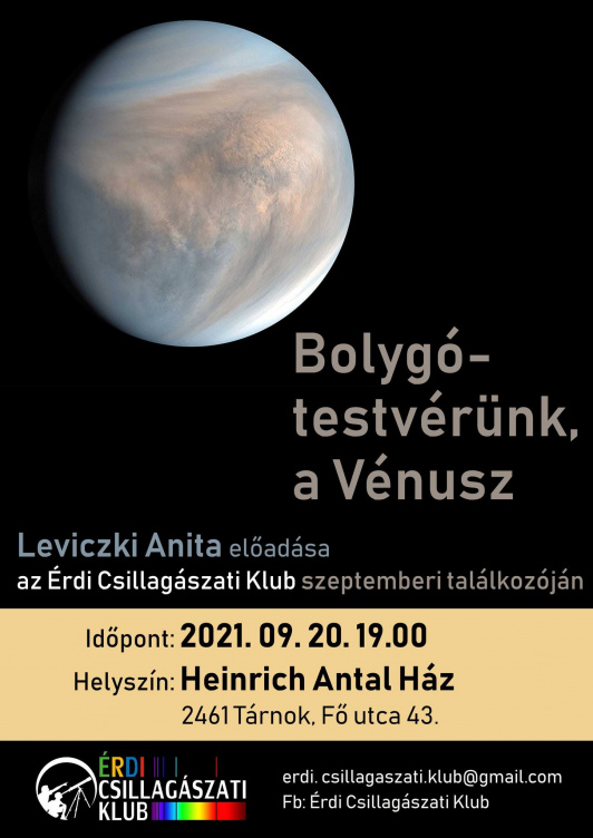 Tudomány2021. szeptember 19. 09:00erdmost.huVénusz a fókuszbanAz Érdi Csillagászati Klub szeptemberi témája a Vénusz bolygó lesz. A rendezvényt Tárnokon tartják, a Heinrich Antal Házban, 20 órától, előadó: Leviczki Anita.