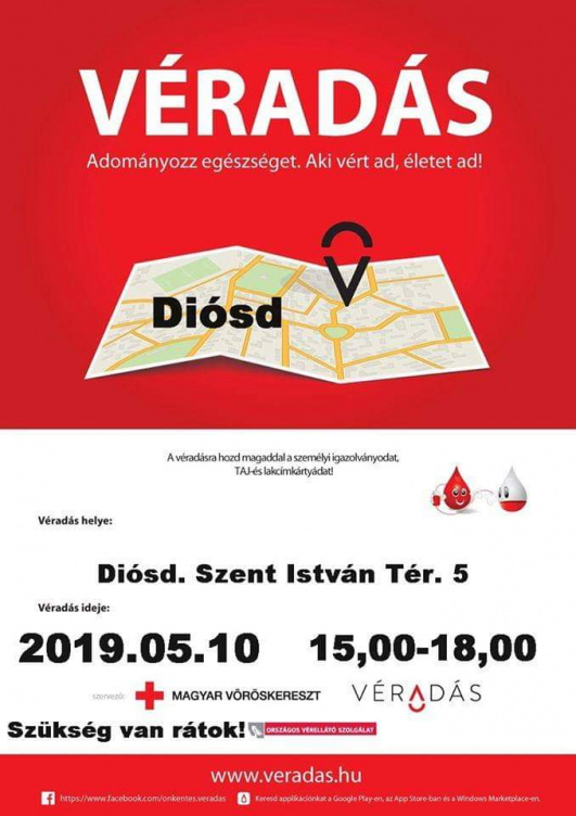 A Magyar Vöröskereszt véradást szervez május 10-én, 15:00-18:00 között Diósdon, a Szent István tér 5. szám alatt. A véradásra várnak minden olyan 18-65 év közötti önkéntest, aki az elmúlt fél évben nem csináltatott tetoválást, illetve testékszert, súlya meghaladja az ötven kilogrammot, és egészségesnek érzi magát.