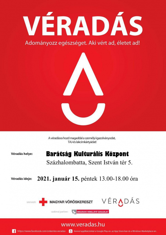 Véradás lesz a Barátság Kulturális Központban 2021. január 15-én, pénteken 13.00 és 18.00 óra között.