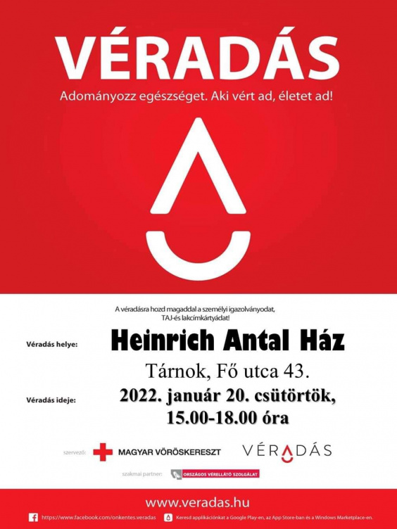 Január 20-án, csütörtökön, a Vöröskereszt véradást szervez Tárnokon, a Heinrich Antal Házban, 15 és 18 óra között.