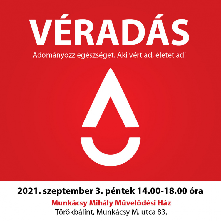 Szeptember 3-án, pénteken Törökbálinton, a Munkácsy Mihály Művelődési Házban adhatunk vért 14 és 18 óra között.
