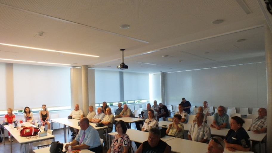 A Magyar Vöröskereszt Pest Megyei Szervezete interaktív előadással készült, amelynek során a vállalkozó kedvű résztvevők bevonásával bemutatta a vágott seb bekötözésének és a kulcscsonttörés ellátásának menetét. Ezt követően Dr. Kakuk Tímea háziorvos adott tájékoztatást a vezetői engedély meghosszabbításával kapcsolatos tényezőkről.
