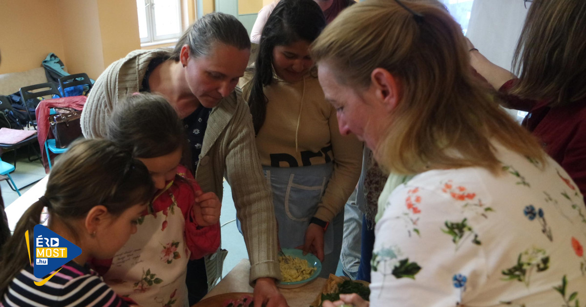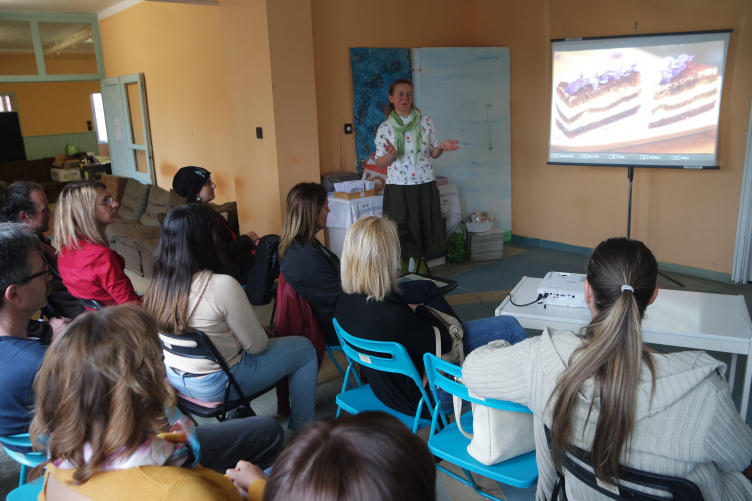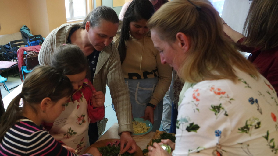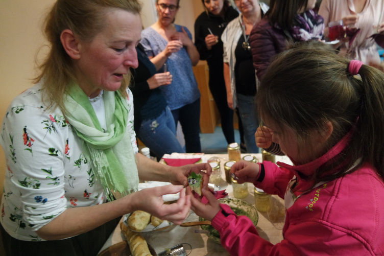 A virágból készült ételeket bemutató előadás után volt mód a kóstolásra is, és nemcsak a virágokat, gyomnövényeket tartalmazó tálból, hanem a helyszínen, gyerekek segítségével kevert csalános krémekből, illetve Monika nyáron eltett rózsa- és pitypangzseléiből is. Mindezekhez házi kenyér dukált, ami nagyon jól illett a friss, tavaszias, zöld ízekhez. Aki kipróbálta, kedvet kaphatott ahhoz, hogy otthon egy-egy szelet süteményt levendulával, vagy épp árvácskával díszítsen, és talán a kertben megjelenő pitypangra sem néz olyan dühösen.