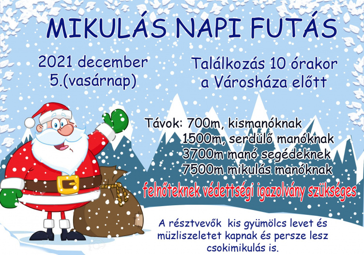 december 5., vasárnap10:00-12:00(Vége)Mikulásfutás DiósdonCsaládiDiósd, VárosházaA nevezők több távon indulhatnak, a 700-tól a 7500 méterig. Felnőtteknek védettségi igazolvány szükséges.