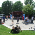 Szombat délelőtt begördült egy piros teherautó a főtérre. Nem bútort hozott, hanem a színpad funkcióját töltötte be: a Modern Art Orchestra jazz-zenészei örvendeztették meg az érdieket egy negyvenperces koncerttel, amin még azok a járókelők is ottragadtak, akik eddig nem ismerték ezt a műfajt.